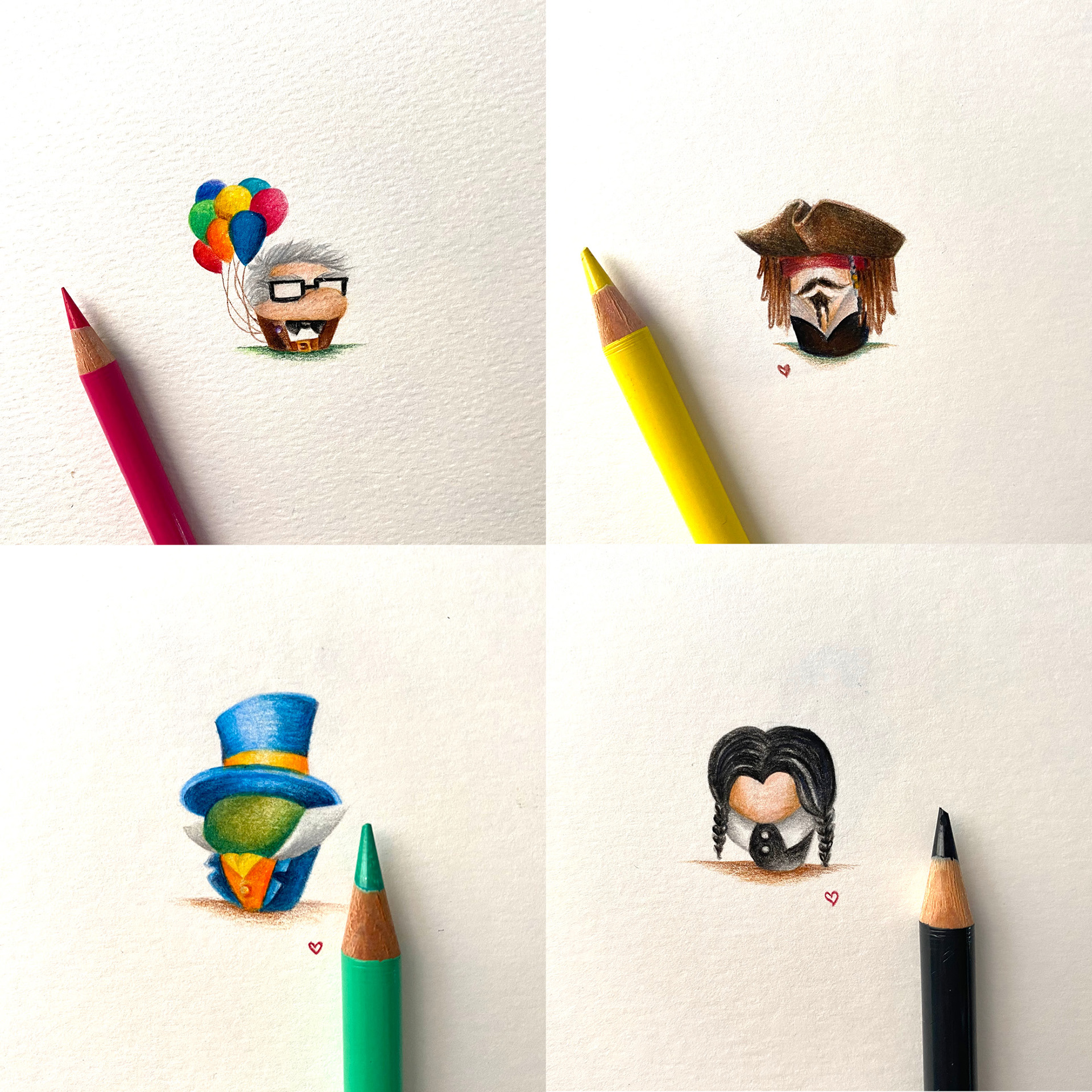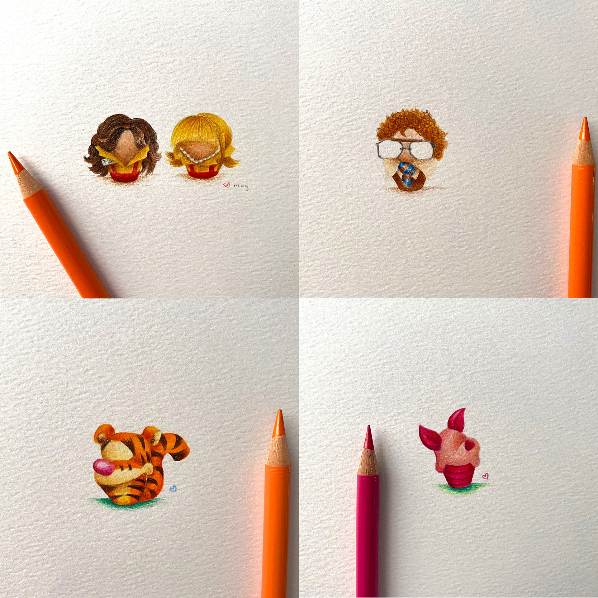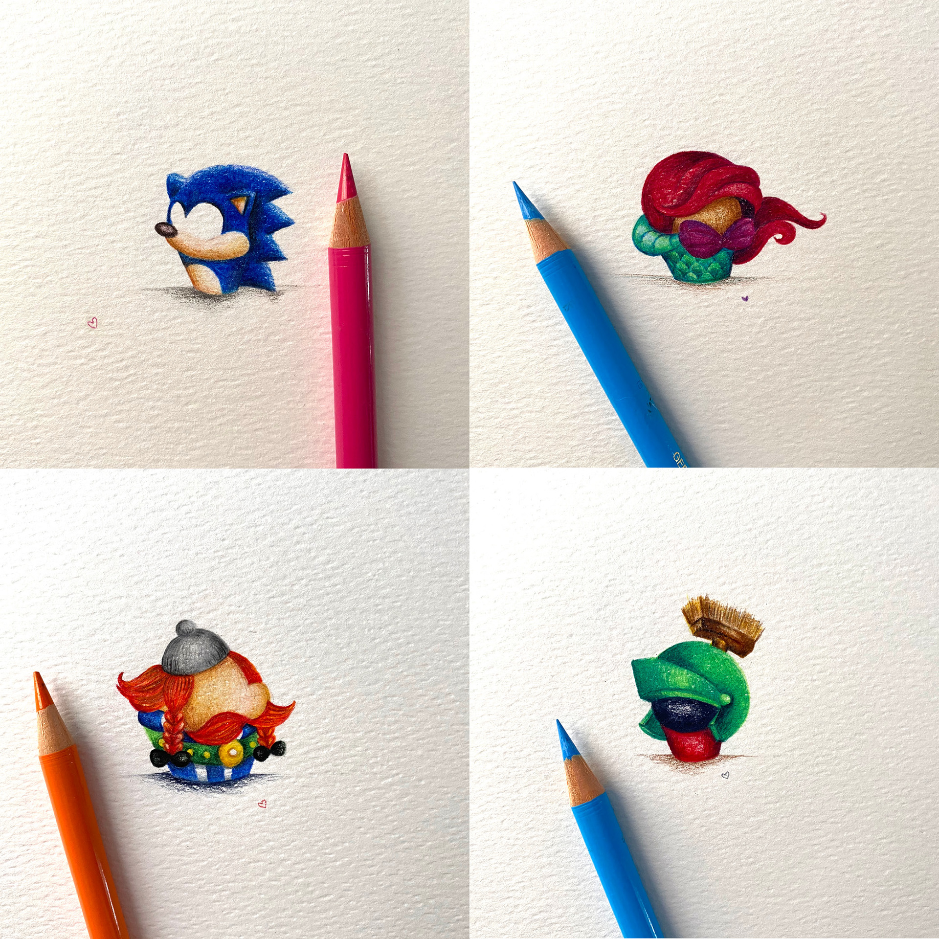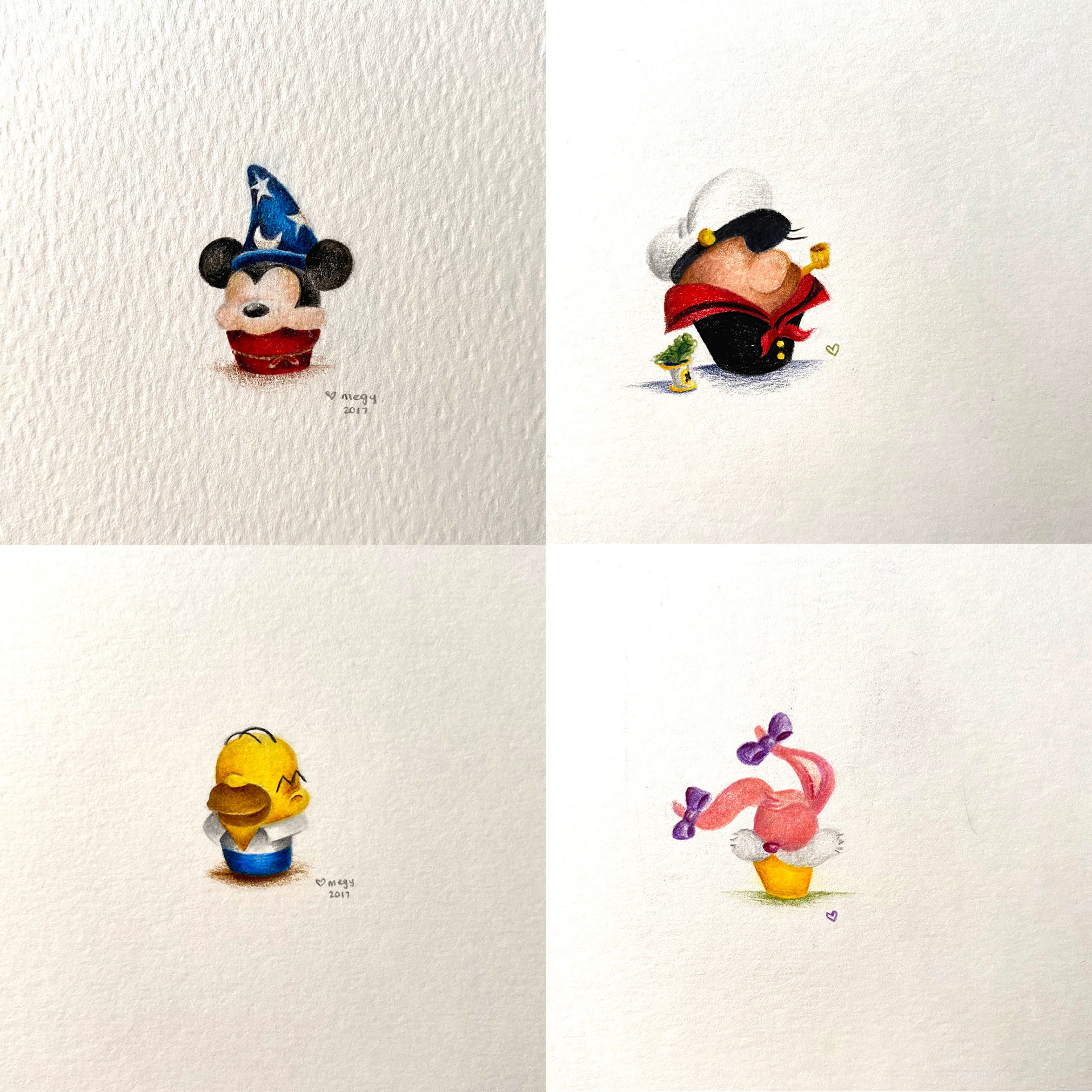 Hand drawn pencil crayon illustrations of pop culture icons turned into cupcakes.