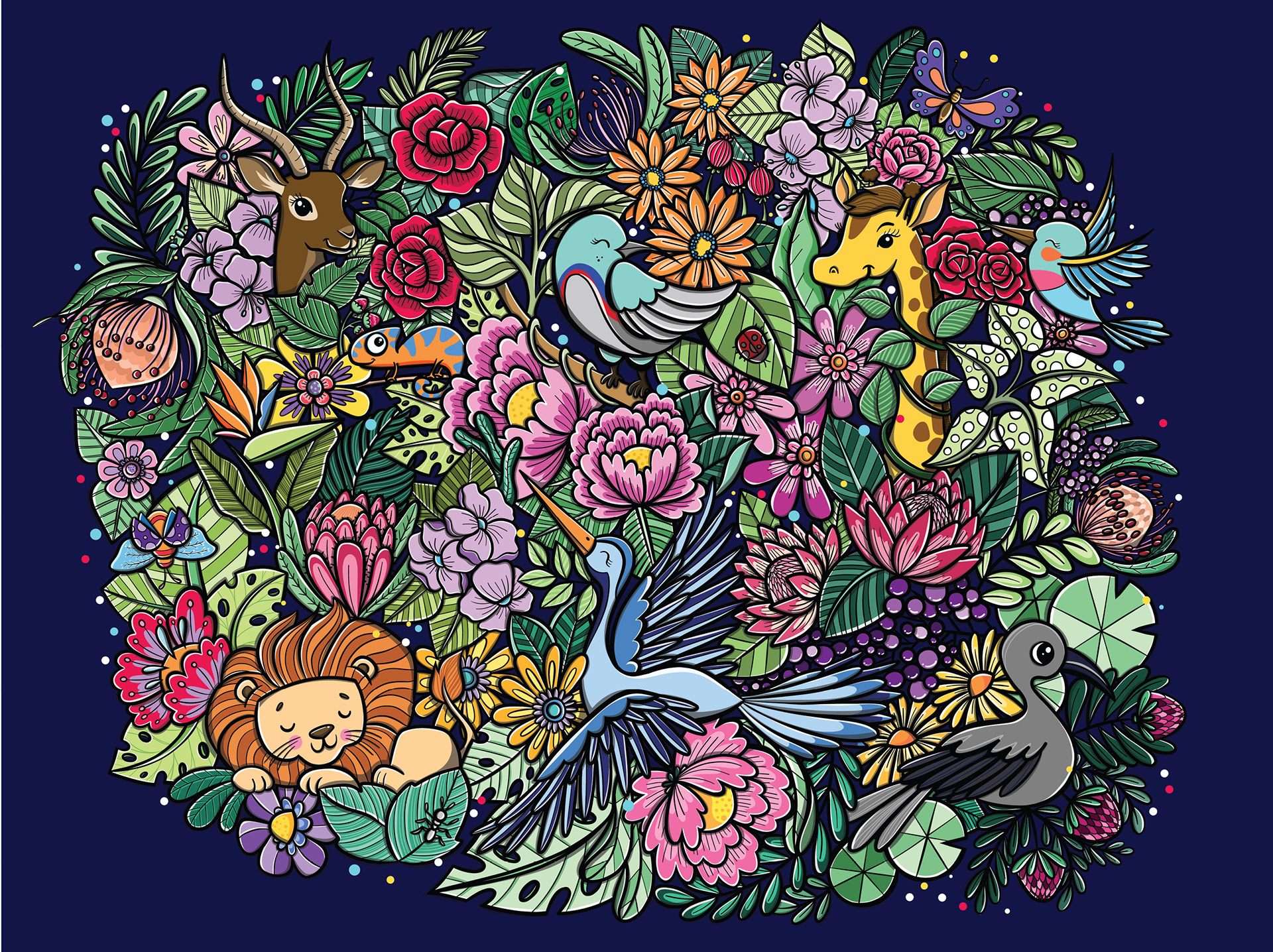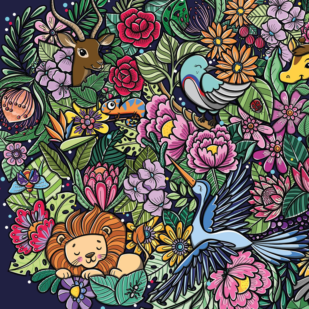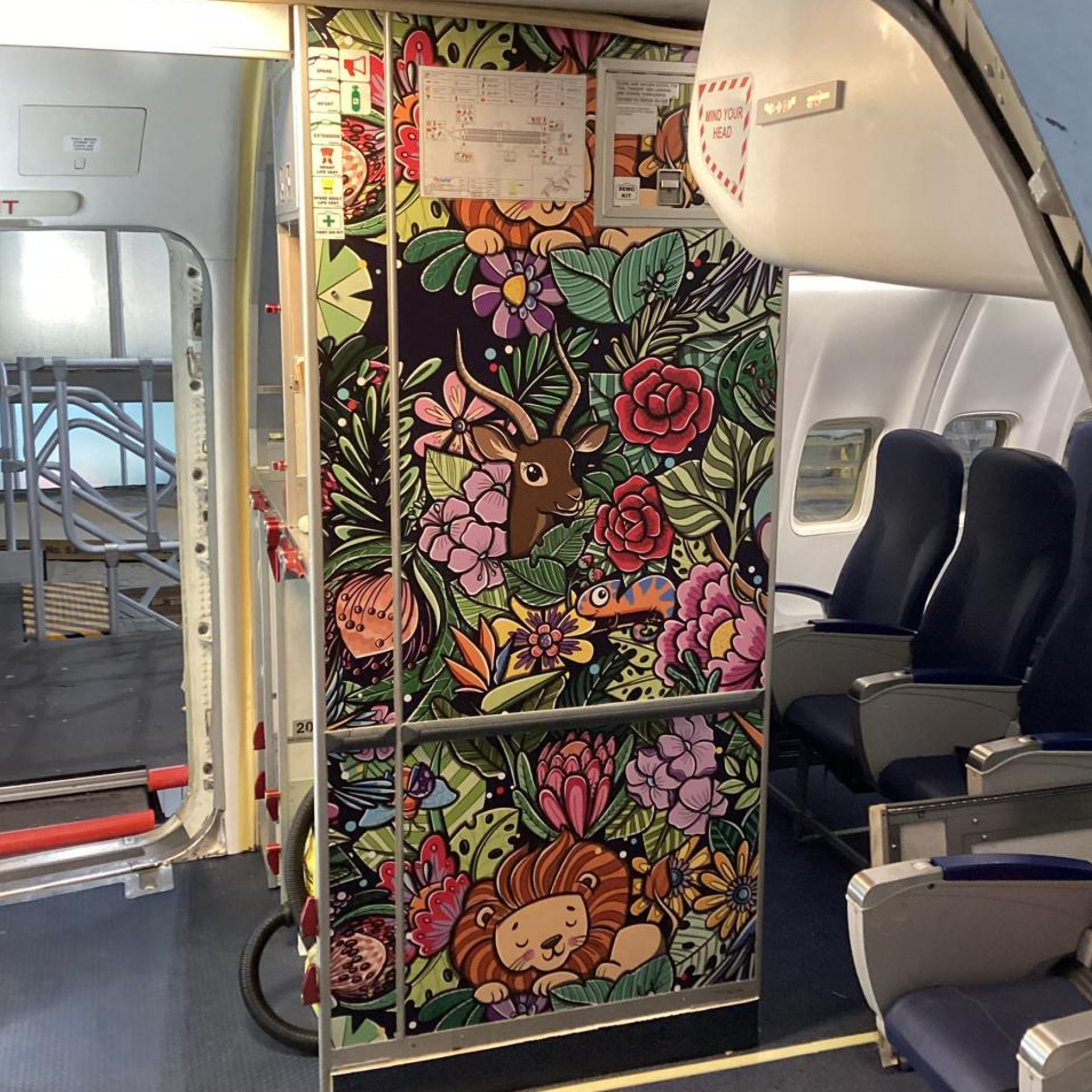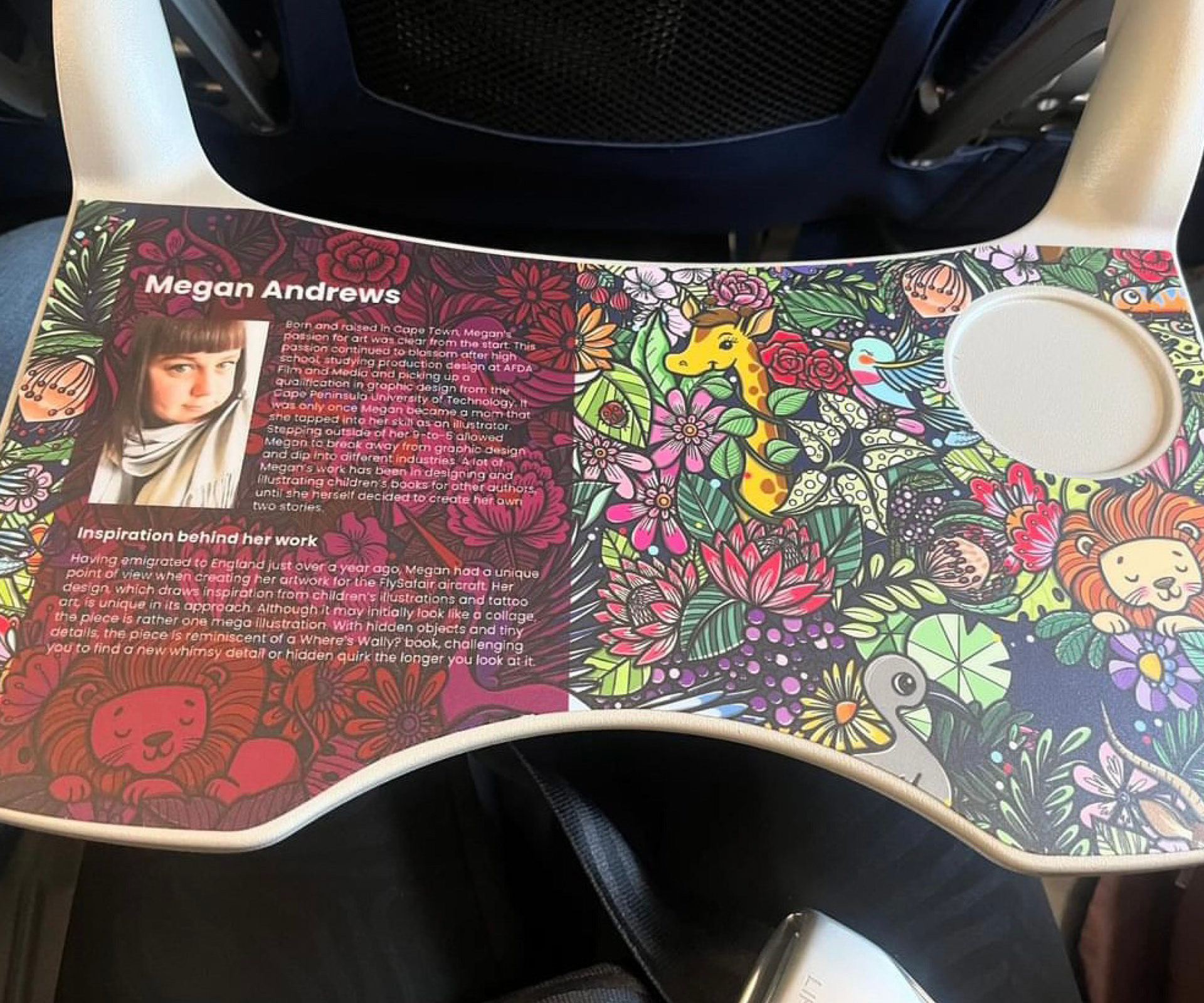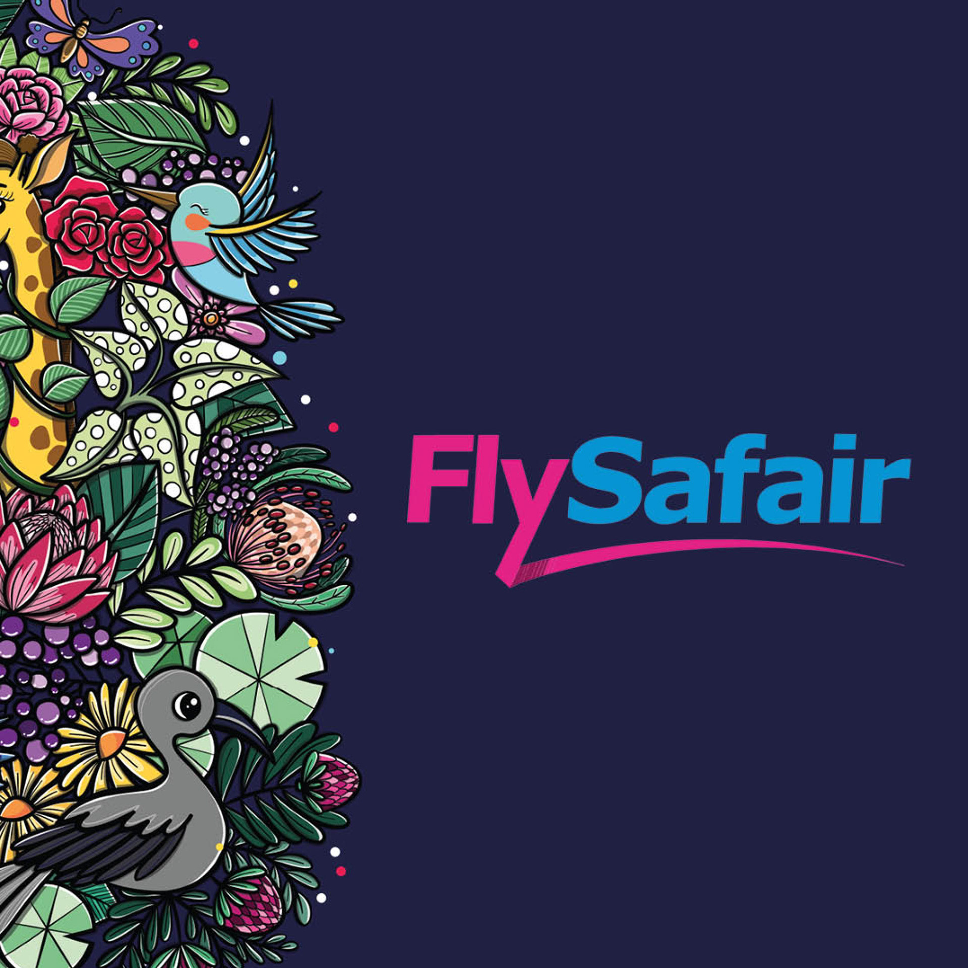 Pattern illustration for FlySafair airlines, being used on the bulkhead, tray tables, on-board magazine and disposable coffee cups.
